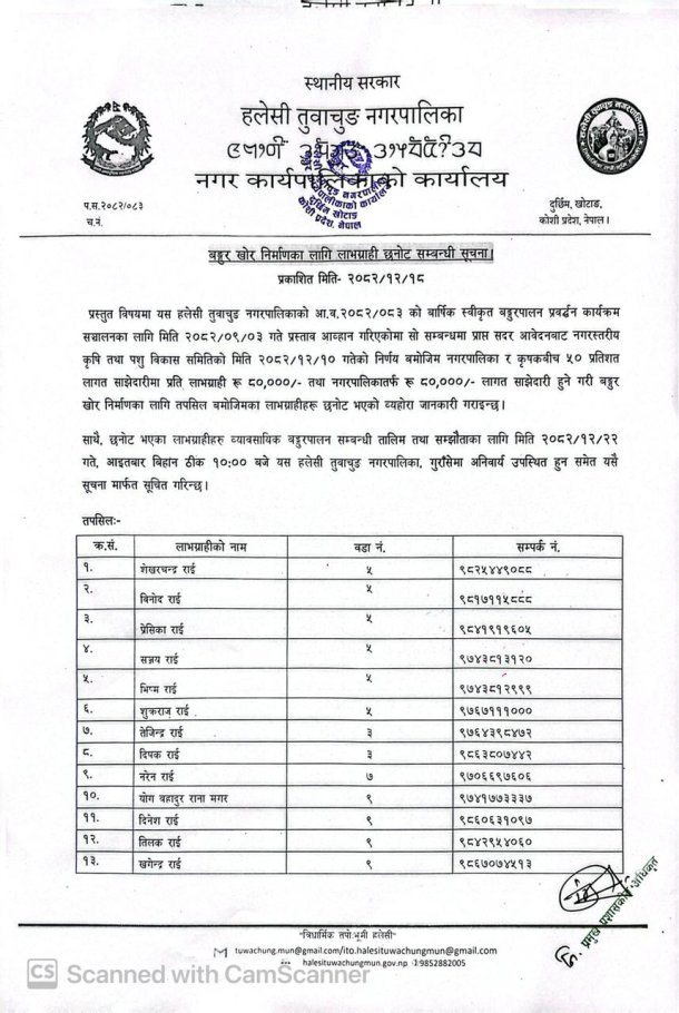 बाख्रा खोर निर्माणको लागि लाभग्राही छनौट सम्बन्धी सूचना ।