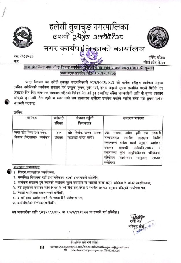 » बाख्रा स्रोत केन्द्र तथा पकेट विकास कार्यक्रमका लागि प्रस्ताव पेश गर्ने सम्बन्धी सूचना ।