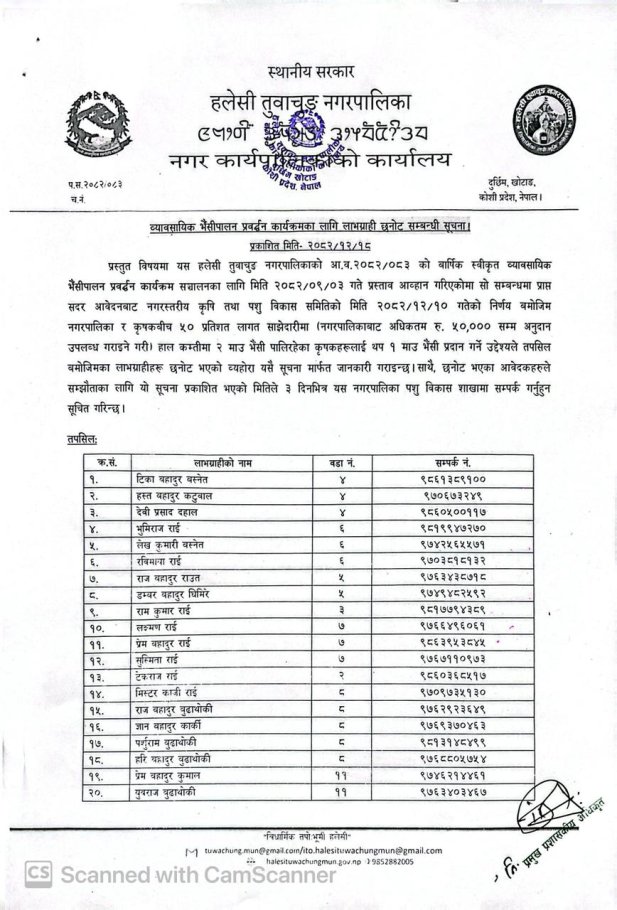 व्यवसायिक भैसीपालन प्रवर्द्धन कार्यक्रमको लागि लाभग्राही छनौट सम्बन्धी सूचना ।