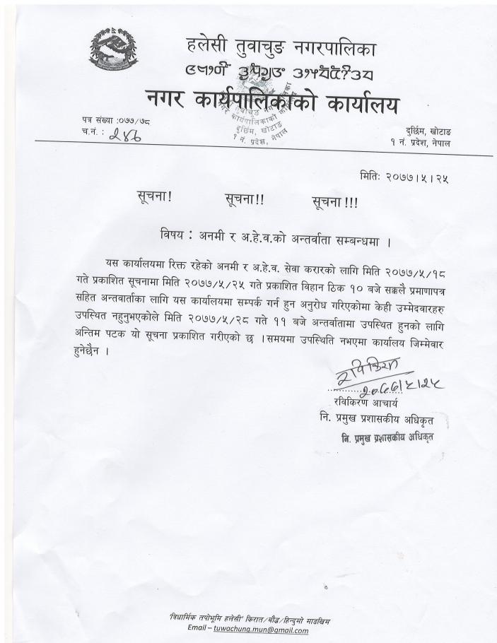 » अनमी र अहेवको अन्तरवार्तामा उपस्थिति हुन नसकेका उम्मेदवारलाई पुनः अन्तरवार्ता सम्बन्धी सूचना