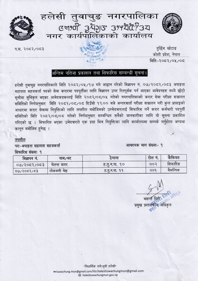 अन्तिम नतिजा प्रकाशन तथा सिफारिस सम्बन्धी सूचना ।