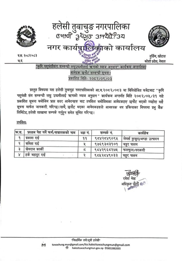 "कृषि पशुपंक्षीसँग समबन्धित लघुउद्यमीलाई ऋणको व्याज अनुदान" कार्यक्रम अन्तर्गतको आवेदक छनौट सम्बन्धी सूचना ।