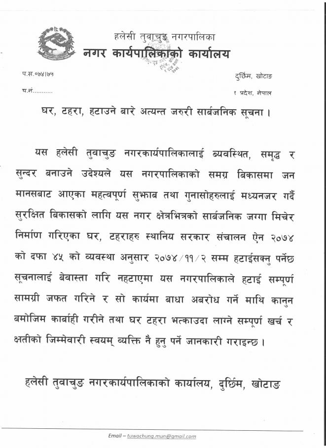 घर टहरा हटाउने बारे अत्यन्त जरुरी सार्वजनिक सूचना