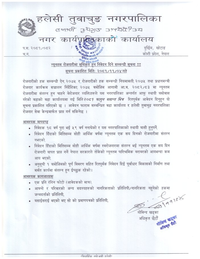 न्युनतम रोजगारीमा सुचीकृत हुन निवेदन दिने सम्बन्धी सूचना ।