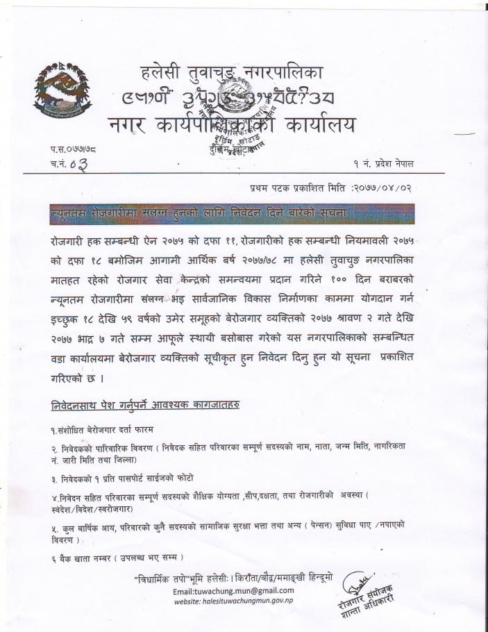 न्यूनतम रोजगारीमा संलग्न हुनको लागि निवेदन दिने बारे सूचना ।।