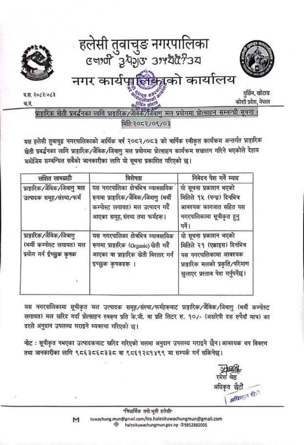 प्राङ्गारिक खेती प्रवर्द्धनका लागि प्राङ्गारिक/जैविक/जिवाणु मल प्रयोगमा प्रोत्साहन सम्बन्धी सूचना ।
