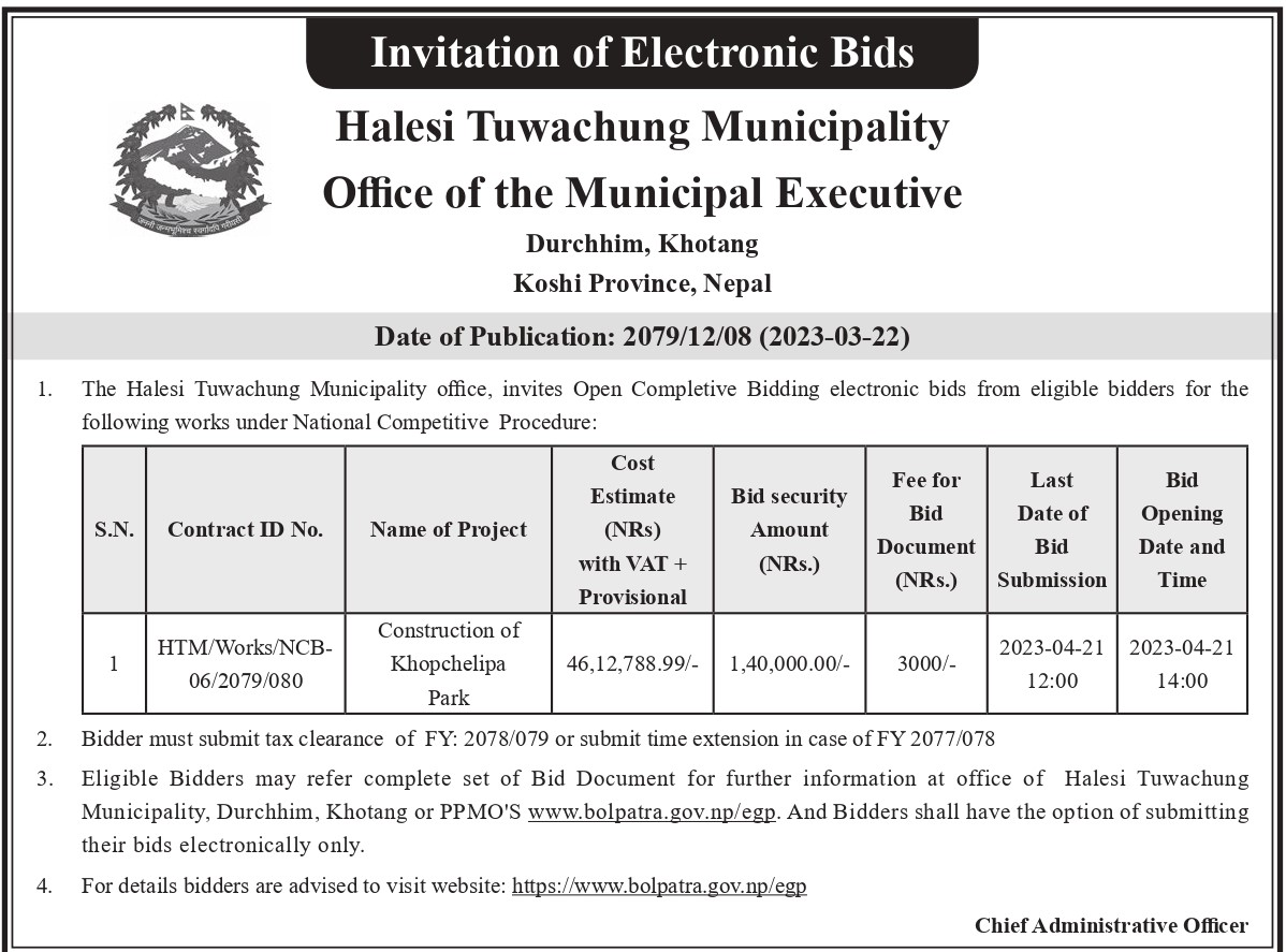 बोलपत्र आव्हानको सूचना ।(खोप्चेलिपा पार्क)
