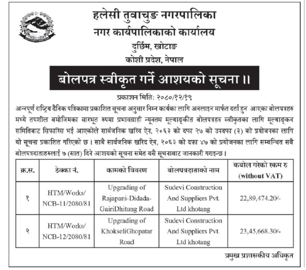 » बोलपत्र स्वीकृत गर्ने आशयको सूचना ।