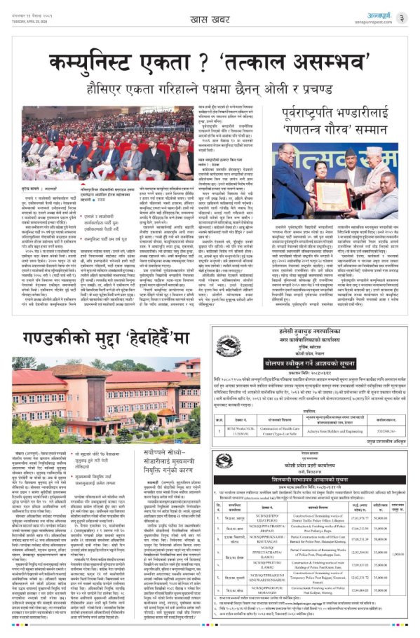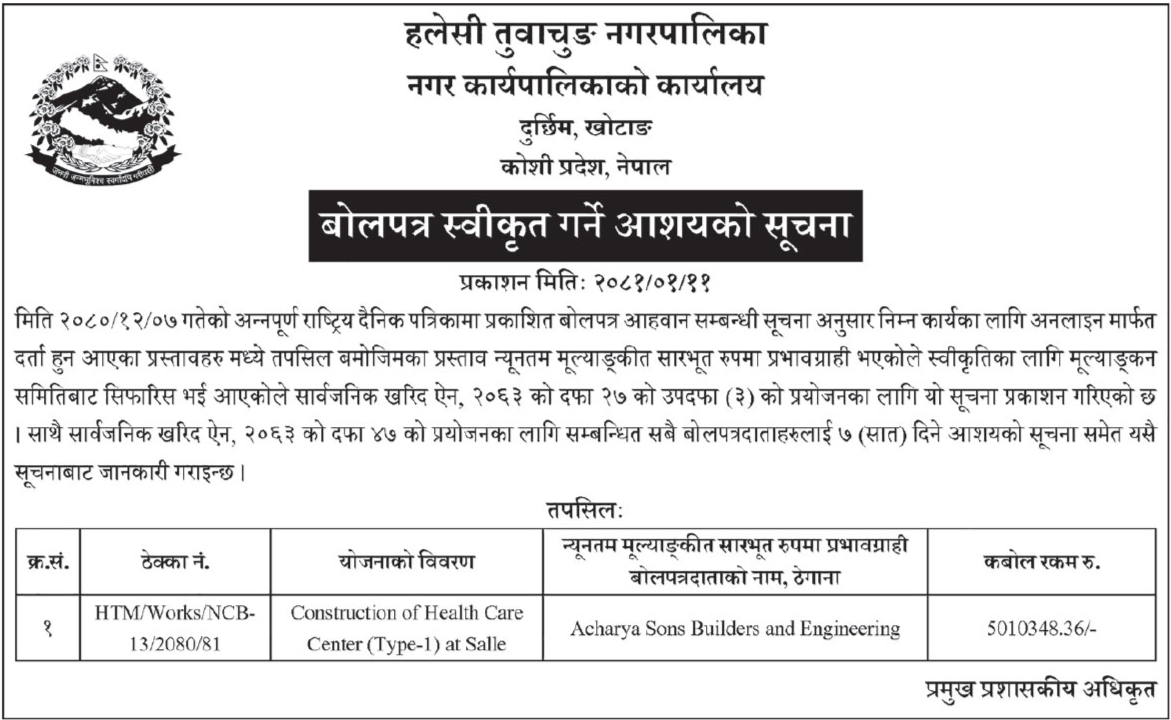 बोलपत्र स्वीकृत गर्ने आशयको सूचना ।(Health Care Center Salle)