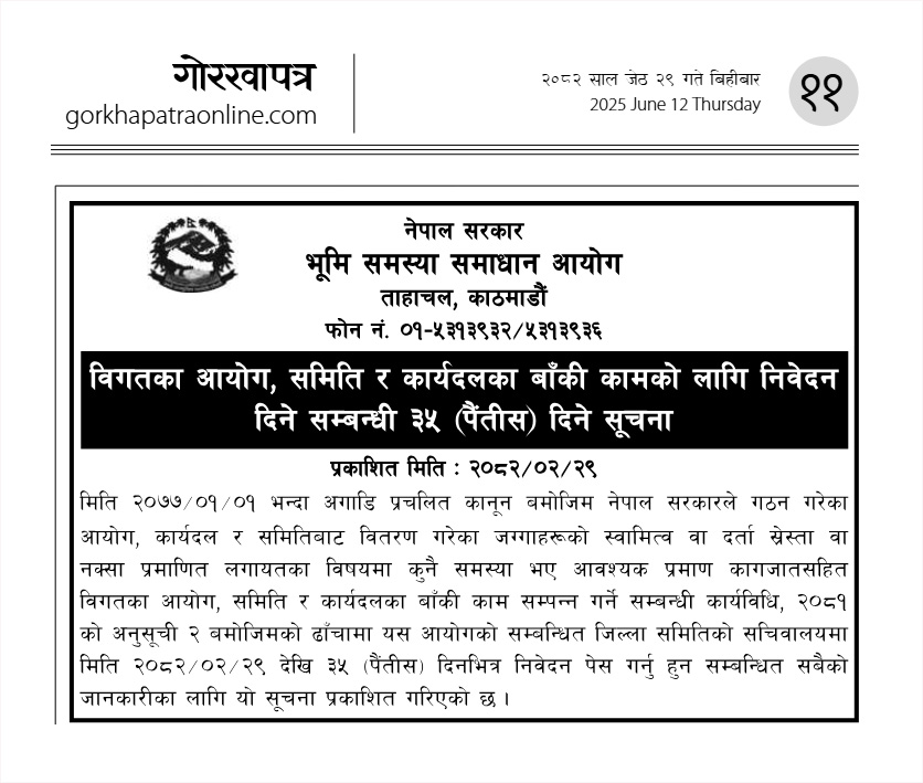 » भूमिहीन दलित, भूमिहीन सुकुम्बासीलाई जग्गा उपलब्ध गराउने तथा अव्यवस्थित बसोबासीलाई व्यवस्थापन गर्ने सम्बन्धी ३५ दिने सूचना ।