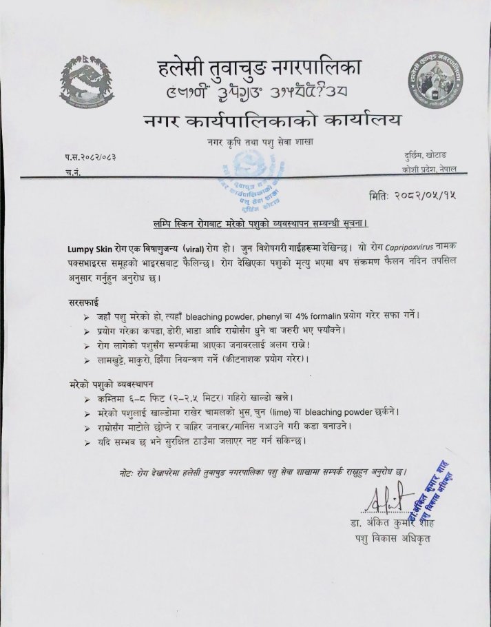 लम्पि स्किन रोगबाट मरेको पशुको व्यवस्थापन सम्बन्धी सूचना ।