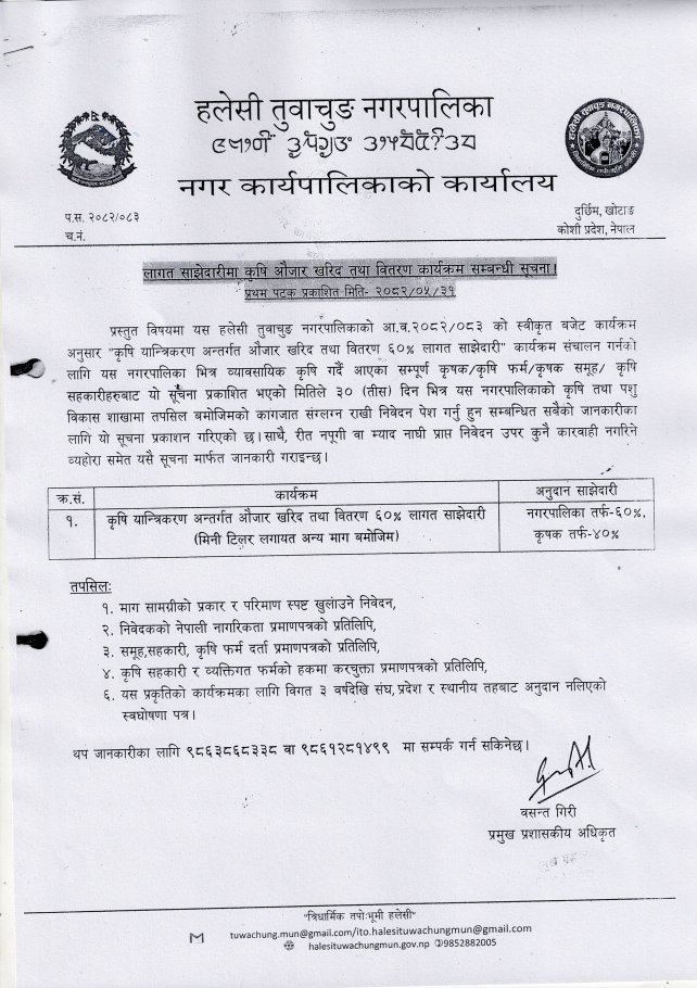 लागत साझेदारीमा कृषि औजार खरिद तथा वितरण कार्यक्रम सम्बन्धी सूचना ।