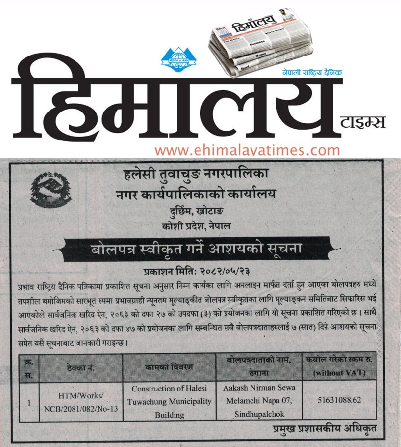 वोलपत्र स्वीकृत गर्ने आशयको सूचना ।