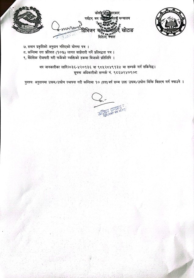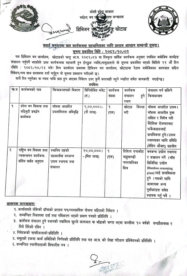 सशर्त अनुदानमा प्राप्त कार्यक्रममा सहभागिताका लागि प्रस्ताव आह्वान सम्बन्धी डिभिजन बन कार्यालय, खोटाङको सूचना ।