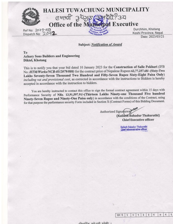 Notification of Award ( Rock Garden, Salle Pokhari and Rainwater collection ponds)