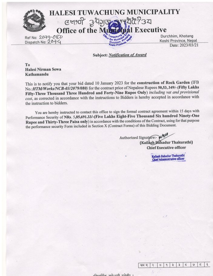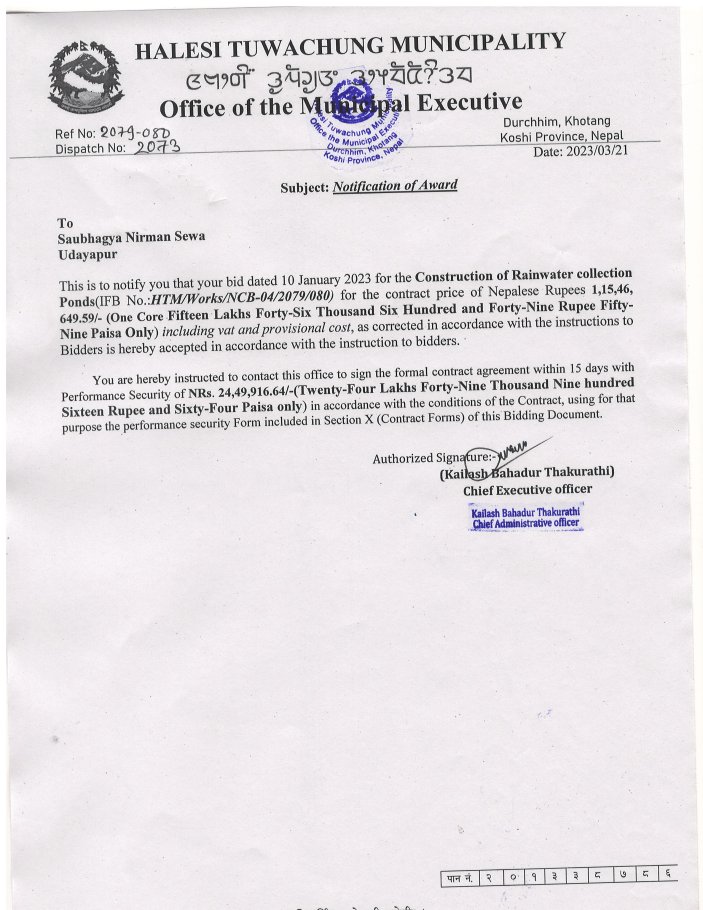 » Notification of Award ( Rock Garden, Salle Pokhari and Rainwater collection ponds)